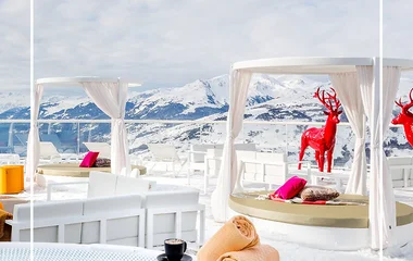 Op de bovenste verdieping van het Resort verwelkomt Le Belvedère u in zijn warme en verfijnde sfeer. Ga de gezellige lounge binnen en accepteer een glas champagne. Majestueuze kolommen zijn gekleed in veelkleurige stoffen en lampen groeien uit ronde boomstronken. Zink in de verwarmde hot tub op het panoramische terras van 390 m2 tegenover een magische dennenbos.